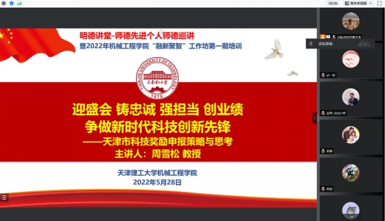 为深入开展“迎盛会、铸忠诚、强担当、创业绩”主题学习宣传教育实践活动,提高教师科研创新能力,机械工程学院联合党委教师工作部,邀请天津市政协常委、天津市有突出贡献专家、校师德先进个人周雪松教授做客明德讲堂,开展题为《迎盛会铸忠诚强担当创业绩,争做新时代科技创新先锋--天津市科技奖励申报策略与思考》的线上主题报告,校党委统战部有关负责人、机械工程学院、电气工程与自动化学院教师代表共计70余人参会。