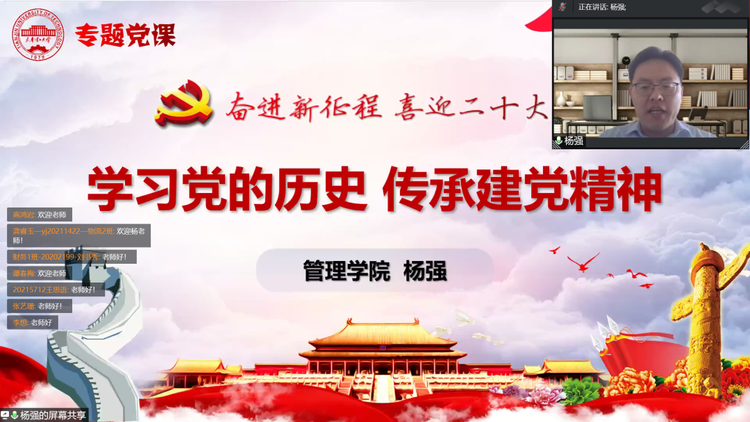 受邀教授分享了自己的求学经历,希望同学们从党史中汲取智慧和力量,将其转化为学习和发展的动力,鼓励同学们乘风破浪,扬帆远航,在学习中追求质的飞跃。以党的发展历程为主要内容,从“树立文化自信”“赓续伟大建党精神”“以史为鉴、开创未来”三个方面解读中国共产党的过去、现在和未来。杨强教授结合实例,为同学们讲解弘扬伟大建党精神是维护巩固发展中国共产党百年历史性成果的必然要求和实现中华民族伟大复兴中国梦的必然要求。同学们也积极互动,发表自己的听课感受。