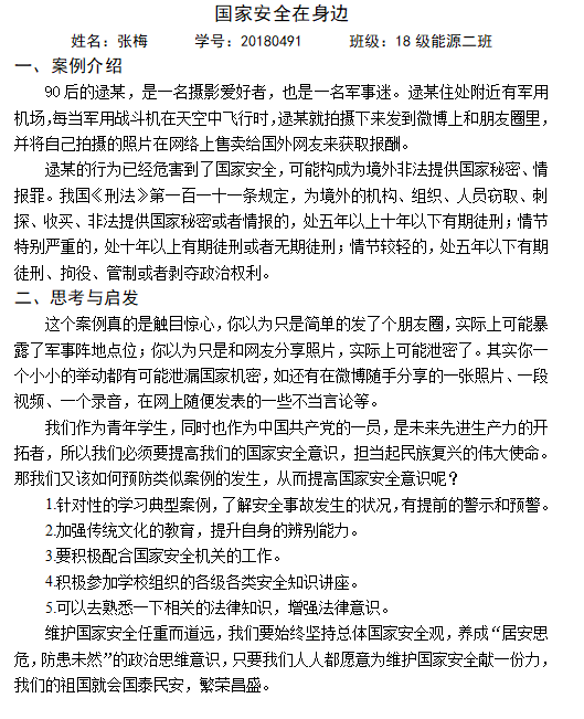 “国家安全在身边”一个案例释真意。当今社会,犯罪分子侵害国家安全的手段层出不穷,党员们以总体国家安全观为指导,通过分享泉州机场亲身经历,分析河南某企业技术人员泄密、高校生李某拍军港泄密、河北某高校学生田某反华等危害国家安全案例,围绕“如何预防类似案例的发生”进行深入思考,明确要时刻保持警惕、树牢法律意识、自觉承担责任。