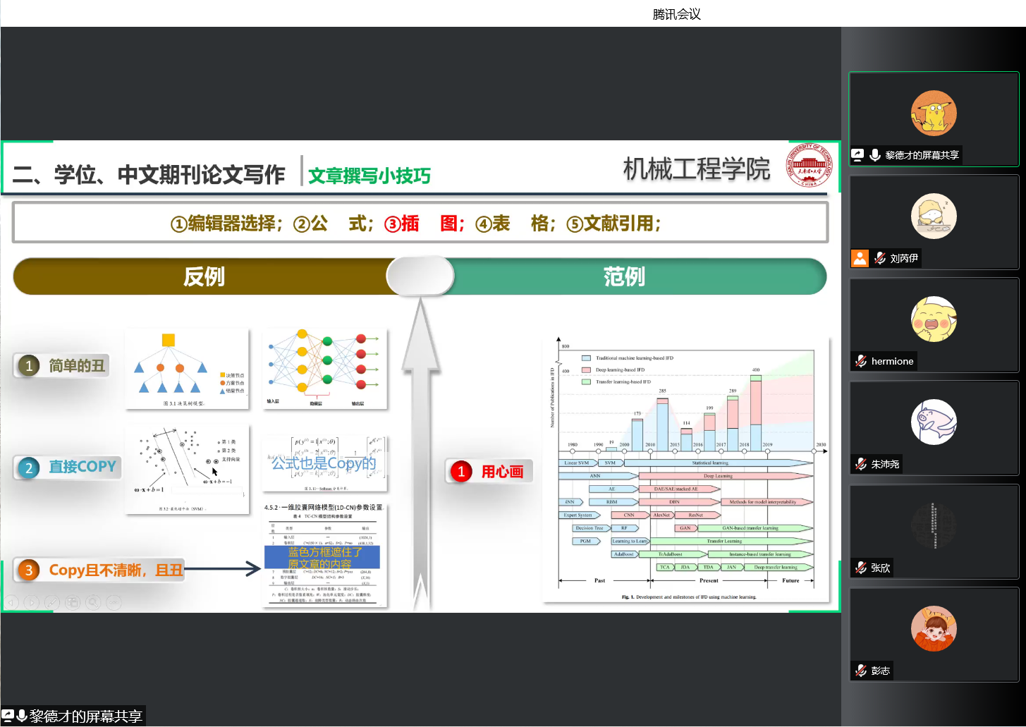 为贯彻落实学校清朗学风建设工程,发挥优秀研究生的朋辈模范引领作用,机械工程学院持续推进“八点半”朋辈辅导系列活动。4月10日晚,留校科研的2020级硕士研究生黎德才,针对留校学生及大四、研一学生分享撰写高质量论文方法与经验。
