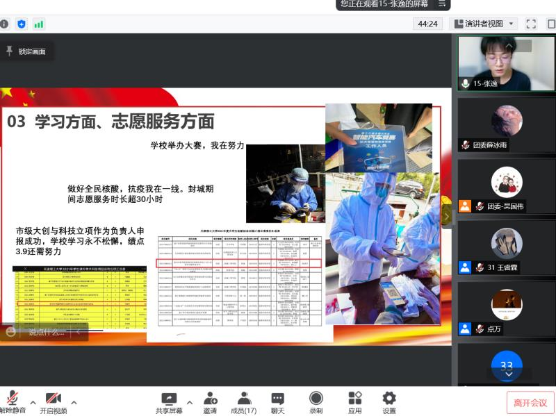 本次推优工作严格程序、严肃纪律,经过个人自主提交申请、团支部民主评选等环节确定参加评审会名单。评审会上优秀共青团员、优秀共青团干部候选人,通过别出心裁的展示向评委老师们呈现了过去一年在学习、生活、科创、志愿服务、班级建设等方面的情况。优秀共青团支部候选班级代表的展示则各显所长,各支部或侧重科创成果,或凸显抗击疫情志愿服务,或分享团日活动特色,重点突出特色鲜明,全方位立体式展现了个人成长与进步。最终,评选出2021-2022年度优秀团支部7个,拟获评优秀共青团团干部22名,拟获评优秀共青团员45名。
