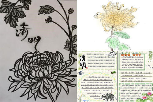 以书画悼先烈、寄思情。在“以画绘情”活动中,学生们将思念之情寄于笔尖,绘于画纸,以手抄报、彩绘等不同形式缅怀先烈,回望先烈足迹。一笔一画,以简单的线条,多变的色彩描绘了学生们对先辈的追忆,承载着学生们对英雄人物敬仰之心,抒发了对已逝之人的思念之情。