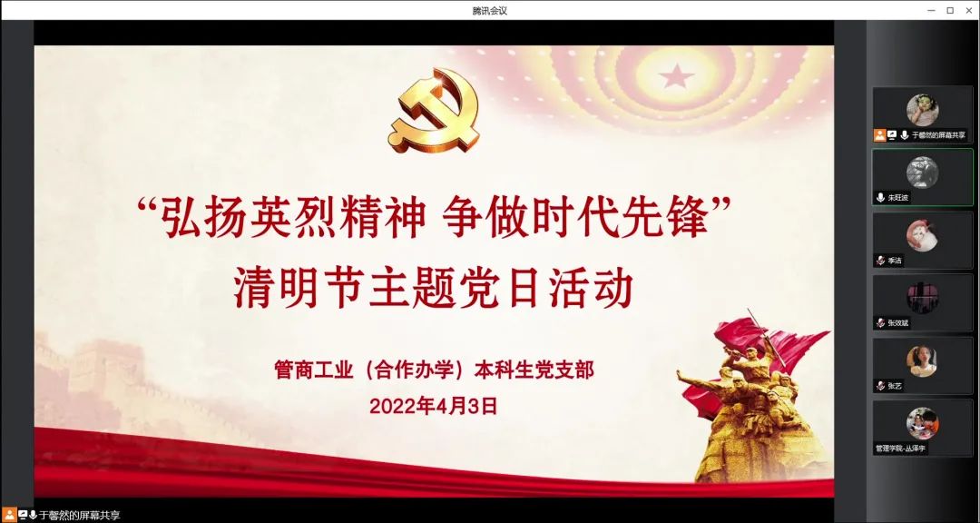 为深切缅怀革命先烈的丰功伟绩,学习革命先烈坚定的理想信念,4月3日,管理学院管商工业(合作办学)本科生党支部开展“弘扬英烈精神 争做时代先锋”清明节主题党日活动,通过线上“云祭奠”方式,缅怀英烈。学院党委副书记、支部书记和支部全体成员参加本次党日活动。