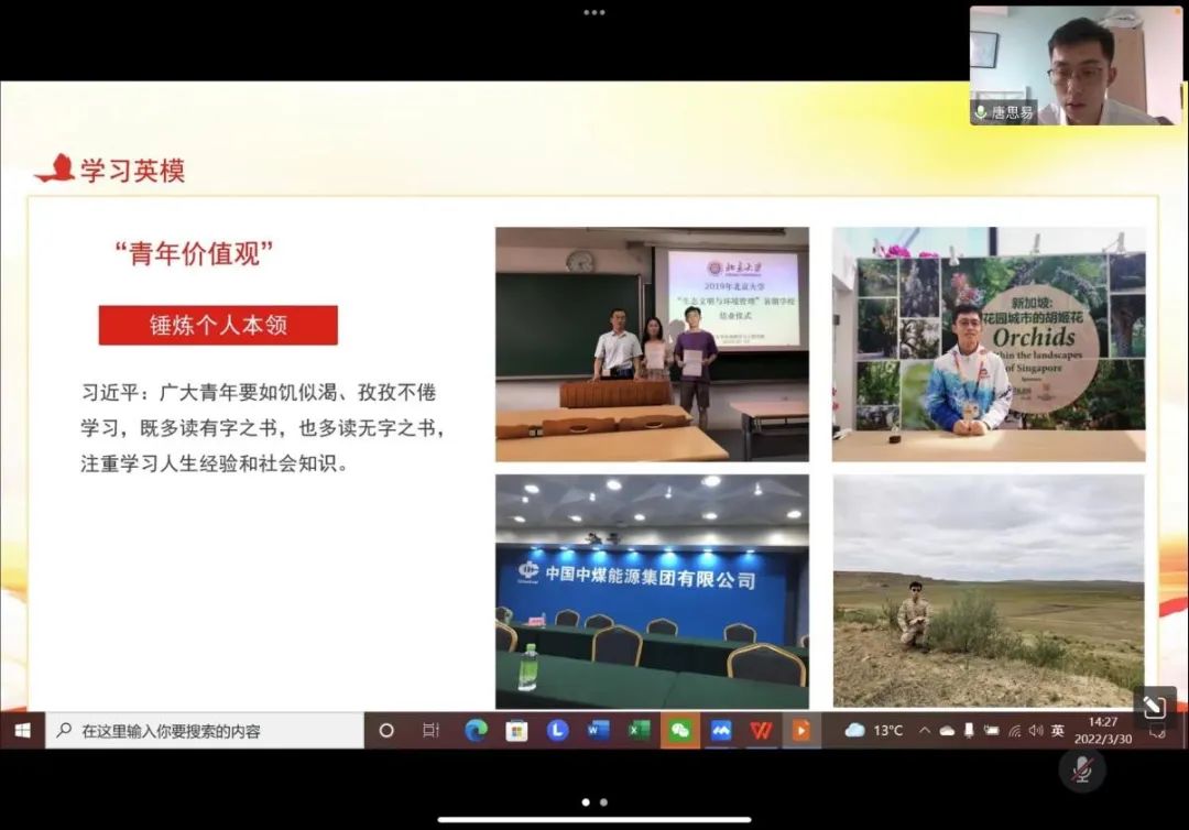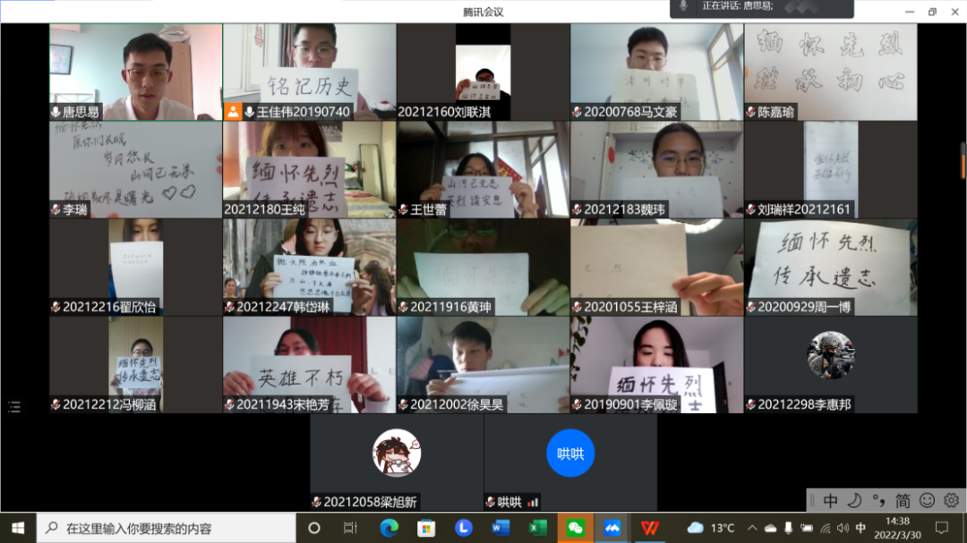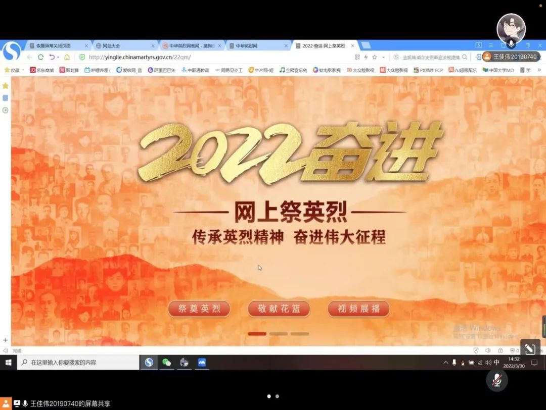 为更好地缅怀革命英烈、传承红色基因,把开展党史学习教育同弘扬优秀传统文化紧密结合,近日,材料学院青年志愿者协会创新形式,组织开展了“相聚云端,祭奠英烈”活动。本次活动同学们通过腾讯会议的方式缅怀革命英烈,学习英烈先进事迹,表达了对英烈精神的崇尚、守望和传承,以奋发有为的精神状态迎接党的二十大胜利召开。