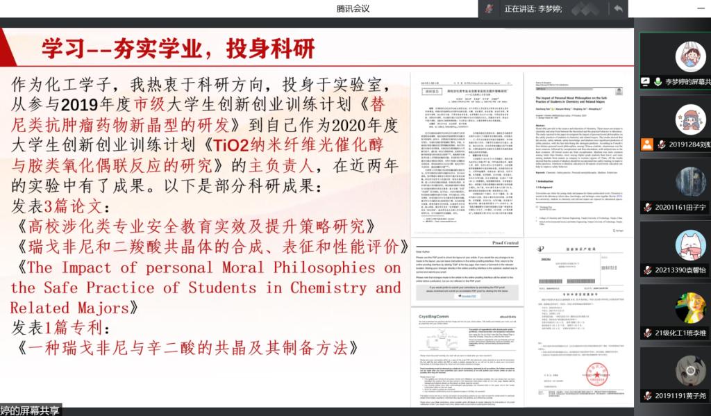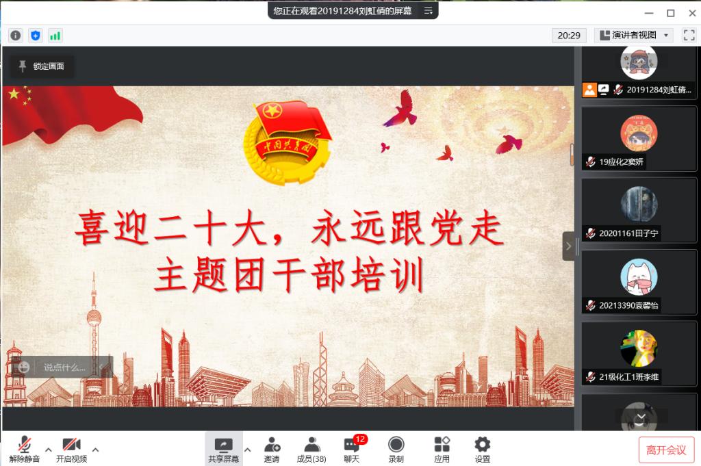 为加强对学生团干部的培养教育,提升综合素质和业务能力,充分发挥好学生榜样的引领作用。近日,化学化工学院举办了新学期“化工榜样”讲堂暨“喜迎二十大,永远跟党走”主题团干部培训会,2021年学校优秀共青团干部标兵李梦婷,以及学院分团委成员、各班级团支书共38人参加培训会。