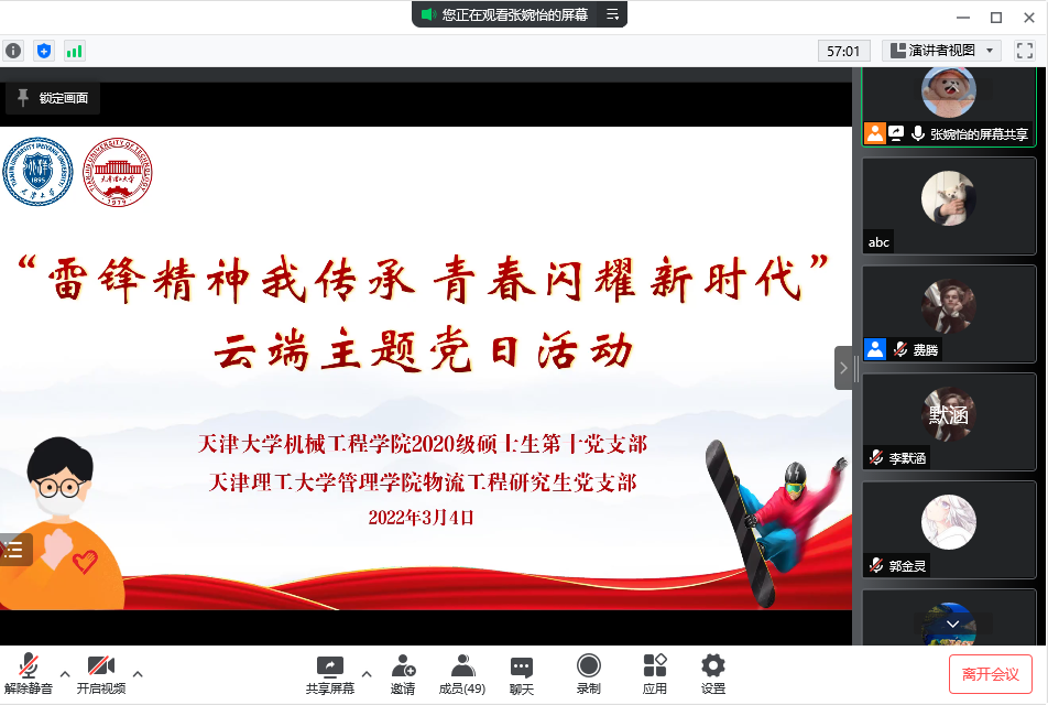 为纪念雷锋纪念日59周年和中国志愿者服务日22周年,进一步贯彻落实习近平新时代中国特色社会主义思想和党的十九届六中全会精神,大力弘扬志愿精神,擦亮青年志愿服务品牌,3月4日上午,管理学院物流工程研究生党支部与天津大学机械工程学院2020级硕士生第十党支部联合举办“雷锋精神我传承 青春闪耀新时代”云端主题党日活动,传递志愿精神、凝聚青春力量。