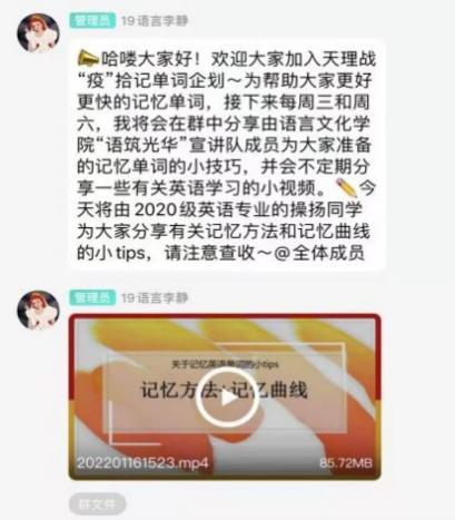 营造学风·在学业帮扶中创佳绩。细化服务强化成果,推进清朗学风建设。为进一步巩固深化“教风学风建设年”活动成果,帮助养成良好的学习习惯,明确学习目标,增强学习动力。寒假期间,学生会以扇贝单词为载体,开展“‘疫’起充电,居家拾词共提升”活动。为期21天拾记单词企划活动,掀起了一股英语学习热潮,前后百余名同学参与,共收集500余张打卡截图,“米兰战‘疫’单词打卡企划”小组打卡率稳定保持在80%以上,在高校排行榜中,小组挤进周排名前20名,半数以上的同学实现了All Combo连续打卡,有效激发了同学们学习英语的热情,挖掘了同学们英语学习的潜力。同时分享“地道表达”以及“用近义词记生词”知识点共计五期100余个,由语言文化学院“语筑光华”宣讲队成员自录自制的六期英语学习专题微课视频,也获得同学们一致好评,进一步助力“清朗学风”建设工程。