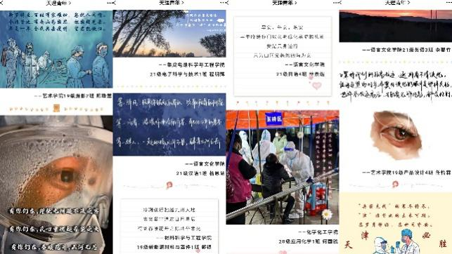 执笔传爱·在文艺战“疫”中送真情。心系学子心理健康,文艺作品传递力量。自天津与奥密克戎病毒的第一场大规模遭遇战打响后,学生会即刻行动,向全校同学们发出“硬刚奥密克戎,献上情书三行”的号召。校院两级学生会共同推动活动进行,广泛宣传,活动期间共收到了超过100份投稿,不断汇聚“战‘疫’有我”的青春能量。依托线上各平台云连线进行创作交流与分享,同时进行优秀作品推送展播,阅读量超过两千,持续传播字里行间温暖力量,助力文艺战“疫”,用一封封“三行情书”向勇敢迎战奥密克戎的白衣天使和志愿者们、向天津这座英雄的城市致敬。