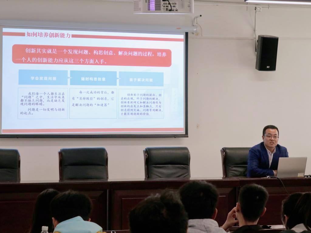 会上,郭富老师从学会发现问题、随时构思创意、善于解决问题三方面引导同学们培养、提升创新创业能力。郭老师建议同学们在逻辑思考能力、无限想象能力、换位共情能力等多方面培养创新必备能力,要用辩证的思维分析问题,掌握科学的思维方法,并结合社会上企业创新的成功方案、生活中学生的创新创业事例为同学们生动地讲解,同学们纷纷表示获益匪浅。