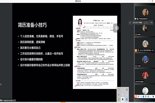 在公考政策讲解的课程中,宋坤衡老师和郭睿恬老师从自身公考经历出发,为同学们分析如何巧妙选岗和备考的核心要点,从公务员的基本待遇、发展空间和备考难度出发,引领同学找准方向、理性备考。在简历和面试指导的课程中;冯宇老师为大家讲解了简历制作的基本原则,如何在千篇一律的模板中展现出自己有趣的灵魂,和应聘的岗位相匹配,让HR快速检索,增加面试机会;丁夙斌老师从当下企业面试的不同类型入手,分析不同面试类型下考察应聘者的基本素质,解析面试技巧,告诉同学们在短时间内提升面试能力的技巧和要素。在求职经验分享的课程中,学院邀请到2020届和2021届成功就业的两名校友,为大家讲解自己的求职之路和职场生活,在面试和作品集准备过程中的技巧和成功经验,解答同学们的困难疑惑。