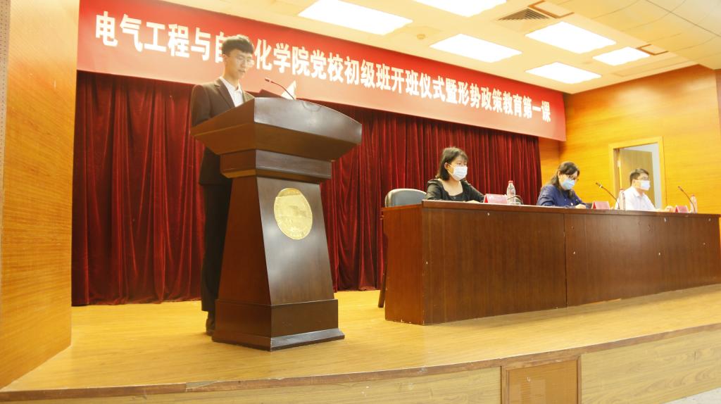 为提高入党积极分子的政治理论素养,端正入党动机,把好党员教育培养质量关,推动学院学生党建工作质量提升,9月23日中午,电气工程与自动化学院第一期学生党校初级班开班式暨形势政策教育开学第一课在理学院报告厅举行,学院有关负责人、辅导员、学生党支部书记以及参训学员共110余人参加。