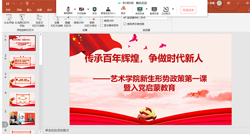 9月22日,艺术学院举办形势政策教育开学第一课暨新生入党启蒙教育报告会,院党委书记宋蕴捷以“传承百年辉煌,争做时代新人”为题讲授,近500名研究生及本科新生线上参会。