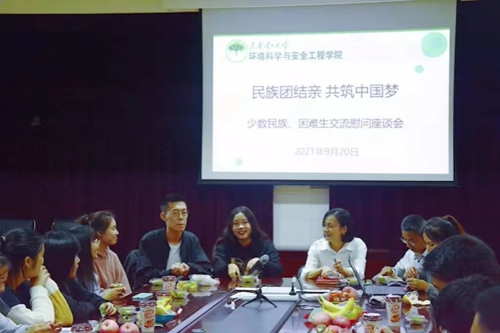为认真学习贯彻习近平总书记关于加强和改进民族工作的重要思想,增进不同民族同学之间的友谊,促进各民族之间的团结,共铸中华民族共同繁荣稳定。在中秋国庆双节来临之际,为了让各民族同学感受到学院如家的温暖和关切,近日,环境科学与安全工程学院召开“民族团结亲,共筑中国梦”座谈会。环境科学与安全工程学院全体辅导员、2021级少数民族学生代表以及2019级、2020级学生代表参加此次座谈会。