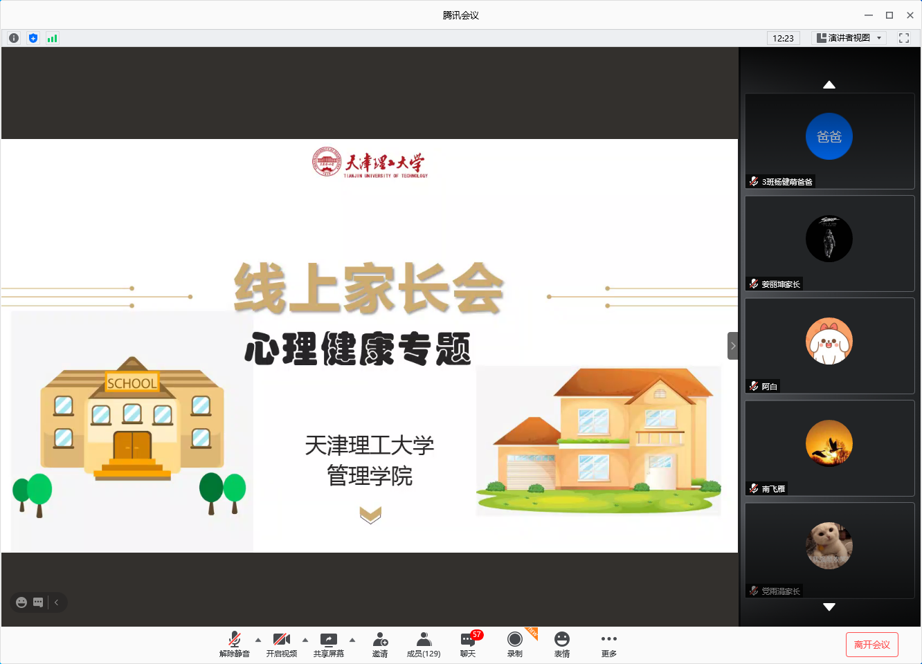 心理健康线上家长会。各专业辅导员老师从家校共育的角度,围绕当下大学生心理问题的主要表现及应对措施,引导家长提升对于大学生在学习、生活中身心状态的了解与关注,建议家长主动学习心理健康知识,与学校老师共同扮演好学生成长过程中“引路人”的角色。