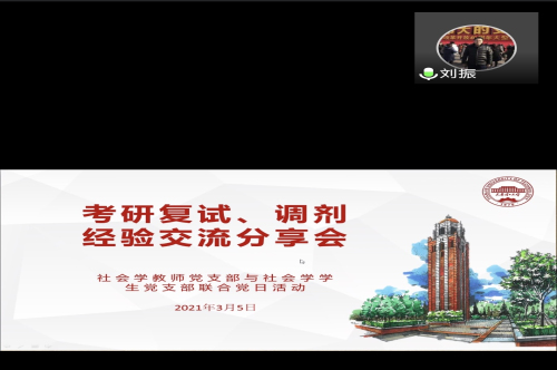社会工作党支部邀请到了教师支部的王淼、杨亮承老师以及刘皓博、梅淑亭、赵梦璇、赵璐、杨家璇和毛雯珊等优秀校友为考研学生开展考研经验分享会;社会学党支部邀请了教师支部的魏智慧副院长、李化斗、刘振和杜胜臣老师以及田梓君、李晓钰、郝雨桐、万梦丽、何姣姣和刘伟玲等优秀校友联合开展考研复试、调剂经验交流分享会,为学生答疑解惑。