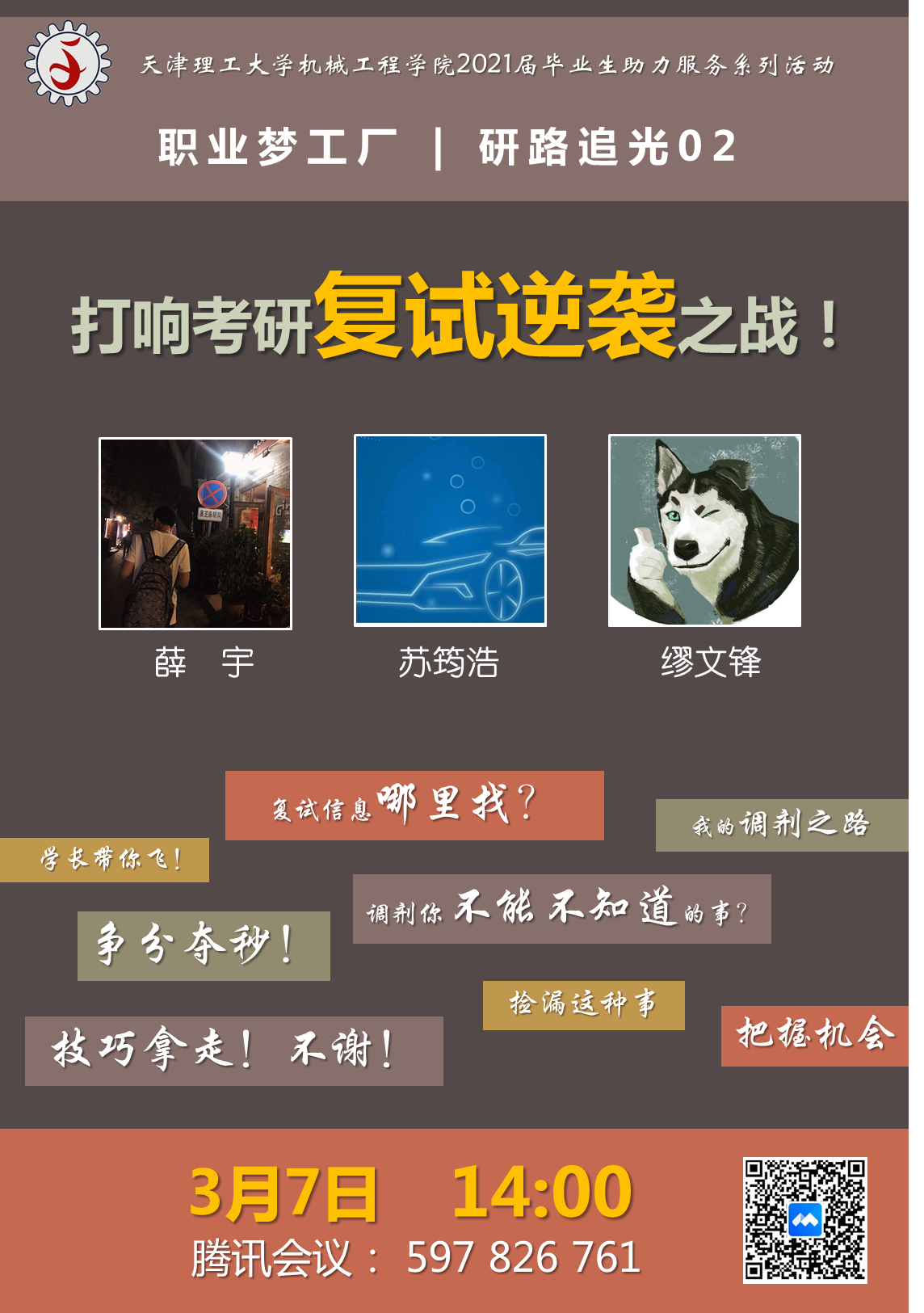 为帮助2021届毕业年级考研学生更有效地准备研究生复试,3月7日,机械工程学院召开“研路追光”云端考研复试经验分享会,邀请2020届优秀学生代表与考生交流面试及调剂经验,2021届部分考研学生、相关辅导员参加交流会。