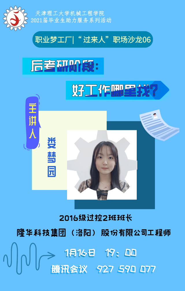 为帮助2021届毕业生做好“后考研阶段”心态调整,提升毕业生春招就业竞争力,助力毕业生增长求职经验,1月16日晚19:00,我院邀请2020届优秀毕业学姐娄梦园做客第六期“过来人”职场沙龙,利用腾讯会议为毕业生讲解“后考研阶段:好工作哪里找?”,2021届部分毕业生参与本次线上交流。