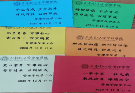 辅导员老师们全覆盖走访全体毕业生宿舍,向每位17级学生送上装有祝愿卡片的文具袋并与同学们共话前程、加油打气。此外还面向17级受助考研学生开展经验交流活动。活动邀请研一同学就考前复习、考前焦虑、考试心态、缓解压力、如何应对考试等方面为即将考研的同学们分享经验;本次活动中,管理学院辅导员老师为受资助考研学子加油打气,告诉同学们要以平常心应对考试,考出自己的最佳水平,希望大家能够在2021年收获一个美好的未来。同时,王天耀书记也表达了对受资助考研学子的美好祝愿与深切关怀,希望同学们在未来的人生路上依旧能够秉承“殚精竭虑、勤勉谦和”的院训,书写人生辉煌。