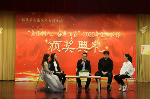 颁奖典礼上,《“青春无悔 未来可期”师长有话说》环节中,邀请了榜样师生代表梁茂教授与黄观兰、郝泽阳、孙瑜奇三位学生,作榜样事迹宣讲,他们分别从教学相长、勤奋学习、成长规划、科研竞赛、考研经验等方面分享了自己的奋斗历程和成长感悟。他们风趣幽默的语言,朴素真挚的表述,列举的身边真实鲜活的事例,不时引发现场观众的阵阵掌声和赞美之声。通过访谈分享,聆听和了解了榜样师生的成长故事,也进一步坚定了广大化工师生拼搏奋进、积极进取的决心和信念。