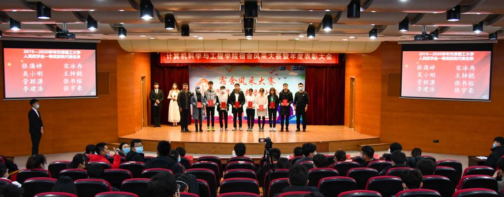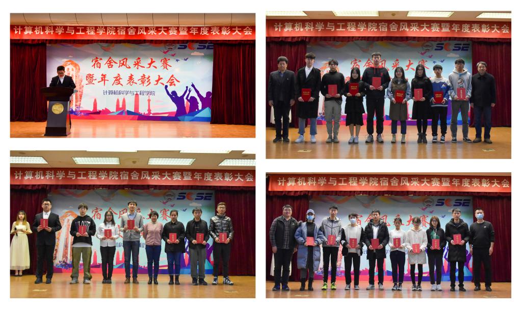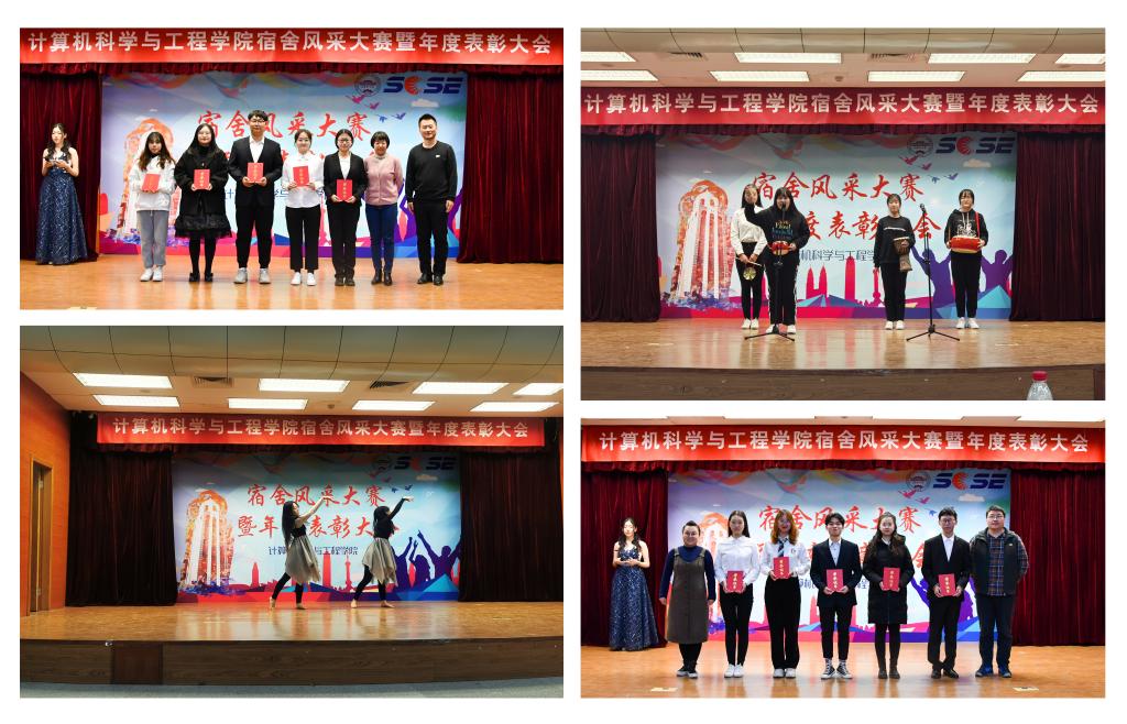 大会还进行了计算机科学与工程学院“明亮清雅之室,同心同德之风”宿舍风采大赛,通过资格赛、复赛、决赛、网上人气投票最终评选出5间荣誉宿舍、5间优秀宿舍和1间人气宿舍。资格赛综合考量宿舍成员的学习成绩、宿舍卫生和今日校园填报率等方面进行打分;复赛通过安全知识竞答和默契小游戏考验宿舍成员的默契程度;进入决赛的十个宿舍,分别在德、智、体、美、劳五个方面通过风采展示和才艺表演竞选荣誉宿舍称号。