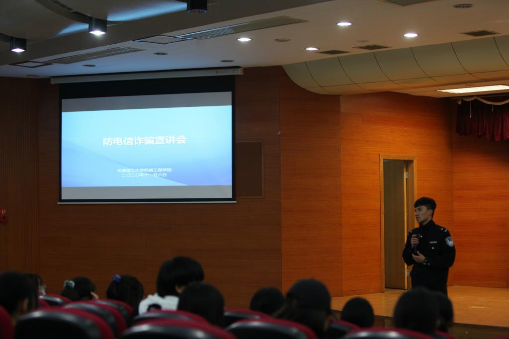 为提升2020级新生防网络诈骗和消防安全意识与能力,机械工程学院于11月6日在环安报告厅举办防网络诈骗及消防安全教育讲座。本次讲座特邀请天津市公安局西青分局学苑派出所的姜浩警官进行了“谨防电信诈骗,共创平安校园”的宣讲,同时学校保卫处刘博洋老师也做了“高校火灾类型及真实案例”的专题讲座。学院学工办老师及2020级新生600余人参与此次讲座。