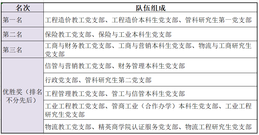 最终,由工程造价教工党支部,工程造价本科生党支部和管科研究生第一党支部组成的第四代表队,由保险教工党支部、保险与工业本科生党支部组成的第三代表队,由工商与财务教工党支部、工商与营销本科生党支部、物流与工商研究生党支部组成的第五代表队分别荣获师生趣味运动会前三名。