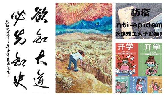 书法作品《品四史》,书写“预知大道 必先知史”,清劲洒脱,刚柔结合,将“四史”的厚重蕴涵于笔势之中;油画作品《秋收》,色彩浓烈、笔触细腻,以“粒粒皆辛苦”的秋收景象,响应“光盘行动”号召,弘扬珍惜盘中餐传统美德;海报作品《开学》,动画作品《防疫》,主题鲜明,生动有趣,表达在疫情防控常态化下,大学生应当如何做好日常防护并坚持不懈,对自己及他人负责。