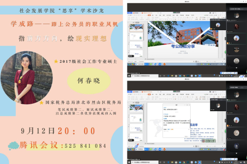 本期活动邀请到学院2020届社会工作专业毕业研究生何春晓。何春晓同学于2020年以笔试成绩第二,面试成绩第二,总成绩第二的优异成绩顺利考入国家税务总局淮北市烈山区税务局,系我院近几年以应届生身份成功入围国家公考的典范。她结合自身的学习、实践经验,分享了在读期间的学业规划、职业规划技巧,重点就公考报考岗位、备考笔试、面试模拟、体检与政审等集中问题,与学生们分享了注意事项与经验教训。此外,何春晓同学还与学弟学妹们积极互动,鼓励大家及早规划,积攒更多实习实践经验,综合全面的考虑学业与就业规划问题并为之坚持奋斗。