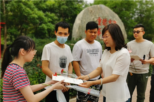 活动过程中,学院领导老师在校训石下为听障生送上精心准备的手绘“米兰印象”明信片,希望他们牢记“重德重能 求实求新”的校训,在未来岗位上积极创新,不断超越自我,实现梦想。毕业生也为领导老师送上康乃馨,感谢老师们四年的辛勤培育,祝愿母校桃李满天下。