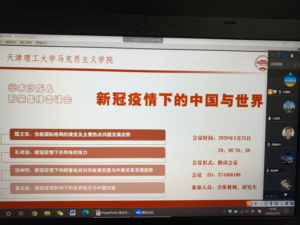 5月25日晚,马克思主义学院利用在线腾讯会议的形式举办了“新冠疫情下的中国与世界”学术沙龙暨形势与政策集体备课会,学院教师、研究生共70余人参与研讨。