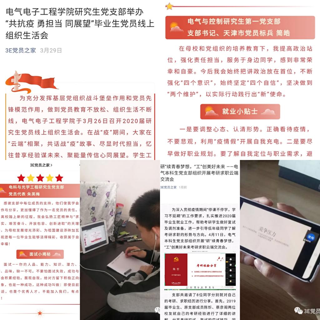 电气电子工程学院各党支部积极响应学院党委号召,通过开展线上党日活动的方式,不仅做到党员教育不放松、组织生活不断线,更在活动中融入职业规划等相关内容。3月,学院研究生党支部举办“共抗疫 勇担当 同展望”毕业生党员线上组织生活会,分享往昔成长经历,共同展望发展前景。4月,电气本科生党支部组织开展考研求职云端交流会,为备战考研复试的同志们答疑解惑,分享考试技巧,坚定考研信心;同时帮助准备就业的同学认知未来的工作岗位,引领其明确就业目标与方向。