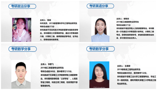 4月1日-2日,为期两天的分享会吸引了近300名大二、大三学子参与。2019级硕士研究生陈硕、柴明月、李费飞、王昊婷分别结合自身考研历程,详细分享了考研政治、英语和数学的宝贵复习经验,并在提问环节中认真解答同学们在备考过程中的各种疑问,提供了硬核备考方案。会前直播交流、会中科目详解、会后单独指导的模式,深受同学们的喜爱和好评,也促进了与优秀学长学姐的交流。