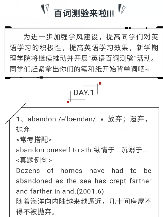 理学院一直以来十分注重加强学风建设工作,特别是针对英语学习多措并举,齐抓共管,形成了长效的工作机制。理学院为促进低年级学生打好英语学习基础,利用理尚往来微信公众号按时推送词汇,建立新生学习交流群定期分享学习资料,并坚持举办每周一次面向低年级学生的百词测验,使同学们词汇量得到不同程度的提高。学院将不断建立和完善学风建设长效机制,将学院学风建设更加扎实有效地落到实处。