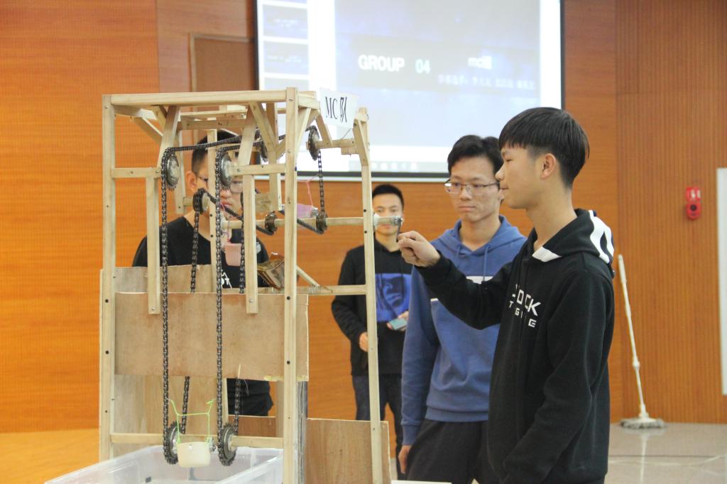 理学院4组参赛选手分别对各自制作的小型定量运水装置进行了现场展示。学院邓家春教授进行了分析与点评,并希望同学们在学好专业课的同时,勇于实践、勇于探索,把书本上的知识学活学透,灵活运用运用到日常生活中,解决日常生活中的问题,用物理知识去打造更便利的生活,用创新的精神去建设科技强国。