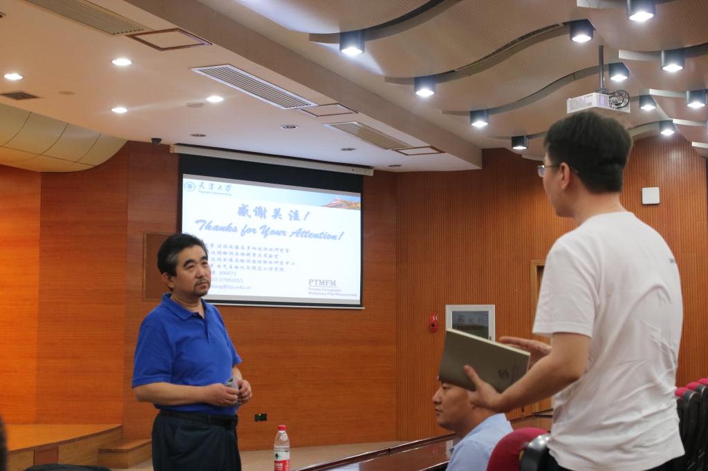董峰教授做了题为“过程层析成像技术研究发展与应用”的报告。报告内容主要包括对过程层析成像(Process Tomography)概念、原理、特点及用途的介绍,同时董峰教授详细讲解了过程层析成像技术的历史发展以及PT技术近年来在国内外的新进展,并为大家展示了其实验室目前的相关研究项目。这一新型过程测量技术已在工业上广泛应用,创新的方法新颖有趣,引起了师生们的广泛讨论和积极提问。在提问环节,董教授与在场师生积极互动,耐心细致地解答疑惑。