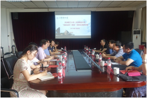应米兰milan官方网站环境科学与安全工程学院、理学院党委联合邀请,天津商业大学生物技术与食品科学学院党委书记、院长鲁晓翔,常务副书记武妮娜,天津商业大学外国语学院党委书记、院长王占斌,常务副书记司源及两院党务工作教师一行六人,于7月8日下午来到米兰milan官方网站17号楼501会议室,参加了环安学院、理学院党委联合举办的“党政主职一肩挑”校际交流研讨会。