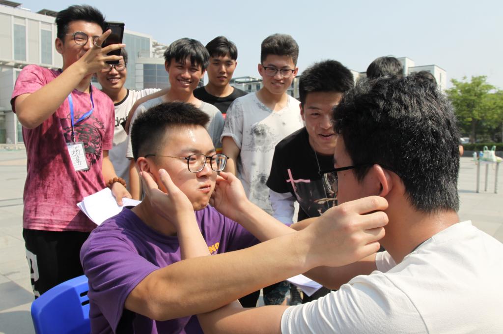 晴朗的夏日,朝阳广场时不时传出鼓掌声、呐喊声,参与心运会的同学们热情高涨。第一个环节“手指饼干运指环”点燃了同学们的兴趣,各队伍分工协作,齐头并进,很快就融入了比赛的氛围之中。第二个环节“你说什么”猜词语,表演者的精湛演技“折服”了在场同学,在欢笑声中诠释了“友谊第一,比赛第二”。第三个环节“我还能行”表情控制赛将活动推向高潮,参与者必须忍住不被逗笑,但每位选手都忍不住露出真诚的笑容。最后,考验体力和团队协作的“趣味接力”,纾解压力活动筋骨的“投篮大赛”大受欢迎,同学们在欢呼声中结束了体验。