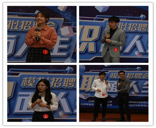 模拟招聘会现场气氛热烈,来自2016级市场营销专业的靳迎春、么伟,保险学专业的张师悦和工程造价专业的任雨杰4位同学自信从容地展开一场意义非凡的“求职之旅”。他们精心准备、镇定自若,现场表现可圈可点,同时也感染和启发着台下的同学们,整场模拟招聘会掌声此起彼伏。四位面试嘉宾分别结合自身成长经历及工作经验,对所有选手的表现综合点评,指出求职存在的问题、误区及面试评判的标准,也对全体学生提出要积极思考职场,不断加强学习、合理定位自身,台下的五位点评嘉宾也分别进行针对性点评,帮助他们提升求职技巧。