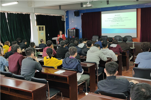 报告会上,捷琳斯卡教授以机器人发展历史为切入点,详细讲述了最前沿的动物仿生机器人研究开发与应用情况。她通过分析水母、壁虎、豹等动物的关节特征,形象生动地为大家阐述了从动物形体中抽象出概念并将其应用到机器人的机构设计中的整个过程。捷琳斯卡教授深入浅出的讲解,引起了现场师生浓厚的兴趣,大家不时报以热烈的掌声。在提问阶段,捷琳斯卡教授与到场师生进行了积极的互动,现场气氛热烈而又活泼。