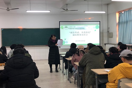 为进一步加强学院学风建设,教育和引导学生遵规守纪,树立正确的竞争意识,营造公平、公正、诚实、守信的考试环境,1月4日下午,环安学院开展“诚信考试,从我做起”诚信考试动员大会,此次活动由学院党委副书记郭晓倩、学工办老师、各班级代表参加。