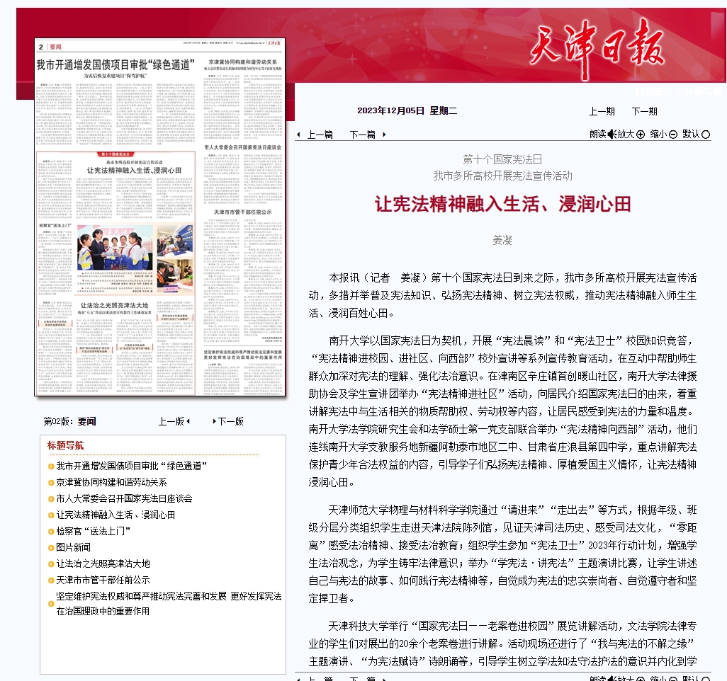 本报讯(记者 姜凝)第十个国家宪法日到来之际,我市多所高校开展宪法宣传活动,多措并举普及宪法知识、弘扬宪法精神、树立宪法权威,推动宪法精神融入师生生活、浸润百姓心田。