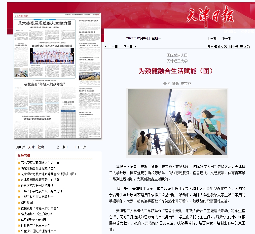 本报讯(记者 姜凝 摄影 姜宝成)在第32个“国际残疾人日”来临之际,米兰milan官方网站开展了国家通用手语校际研学、助残志愿服务、宿舍墙绘、文艺展演、体育竞赛等一系列主题活动,为残健融合生活赋能。