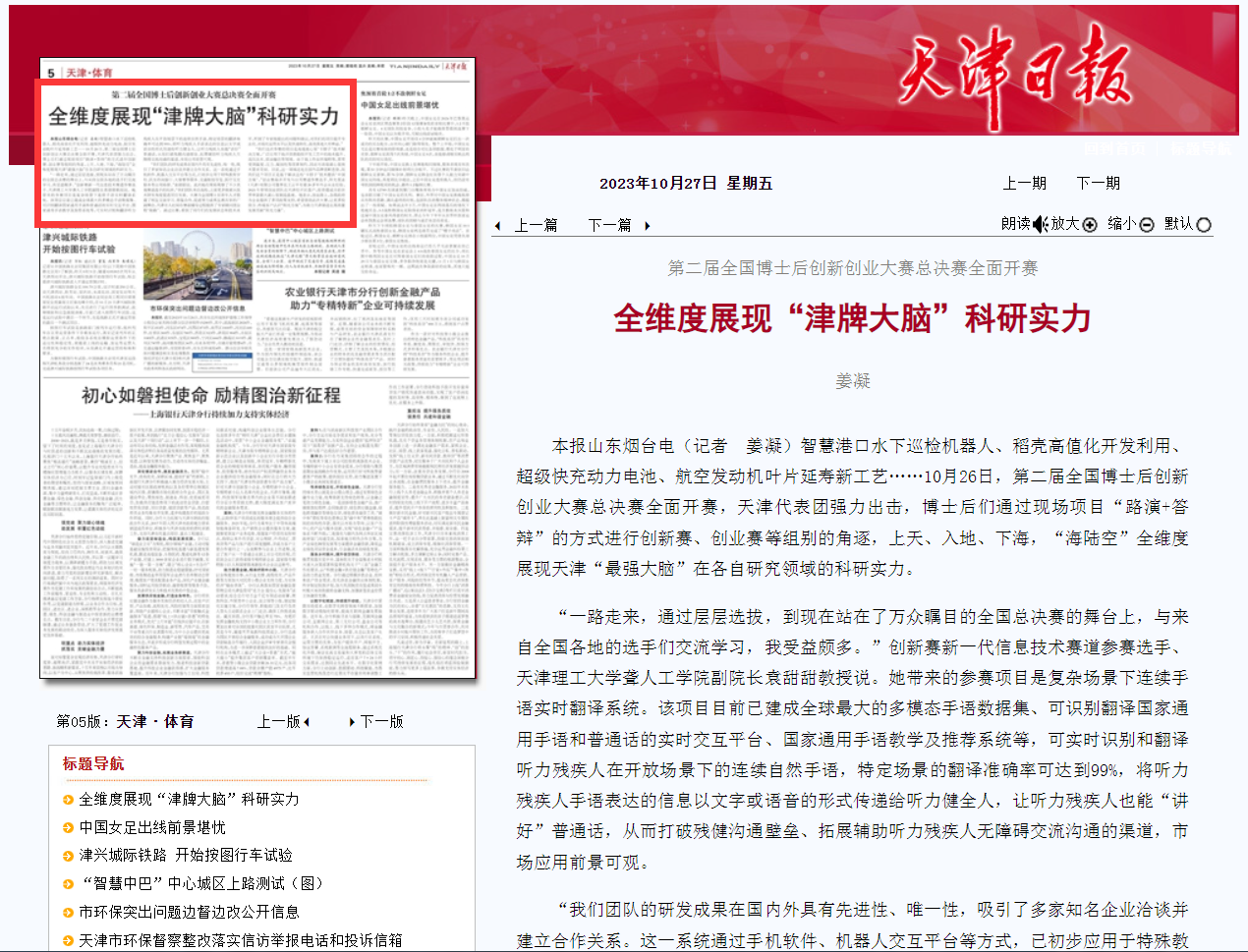 10月27日,《天津日报》报道米兰聋人工学院副院长袁甜甜教授科研项目参加第二届全国博士后创新创业大赛总决赛相关情况。