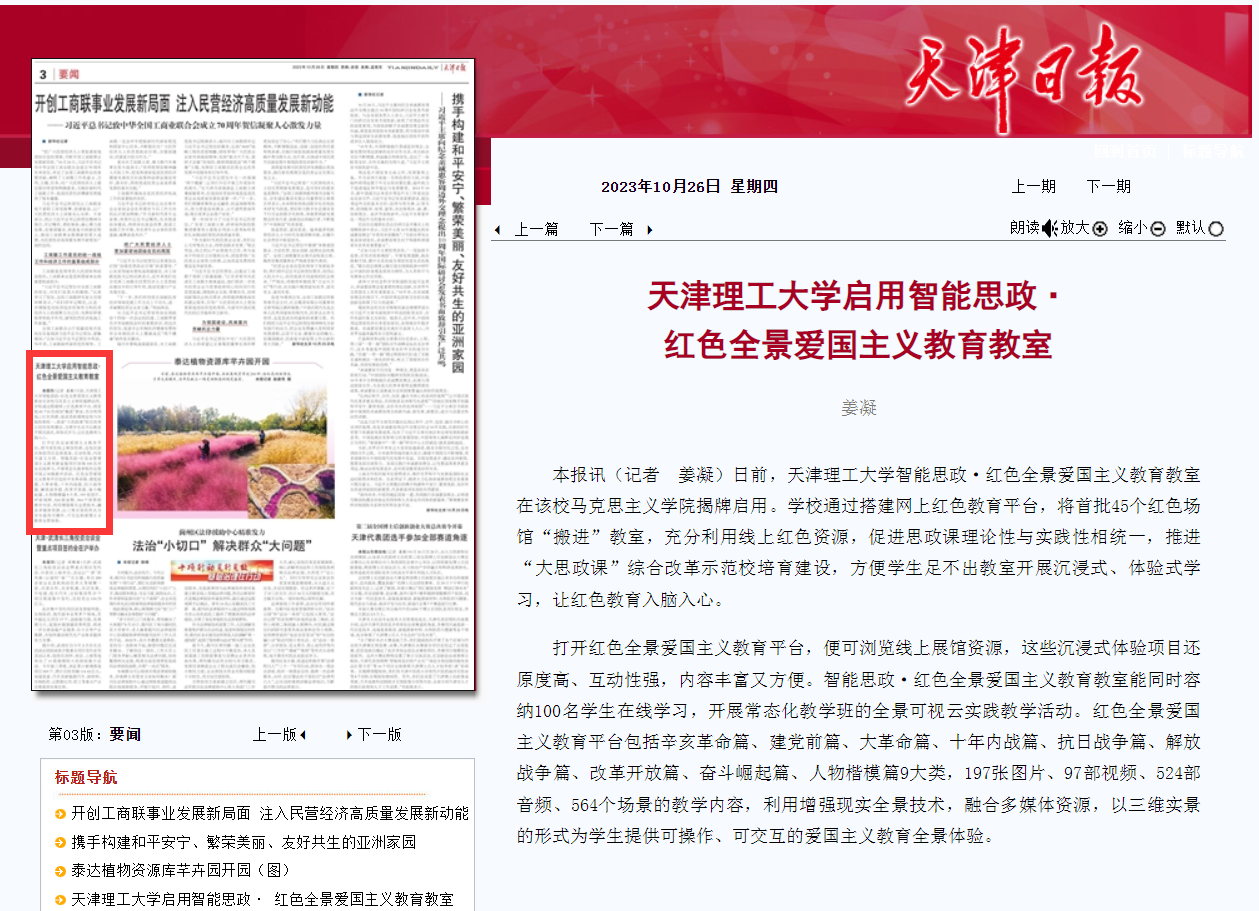 10月26日,《天津日报》报道米兰马克思主义学院智能思政·红色全景爱国主义教育资源平台启用,将红色场馆“搬进”教室。全文如下: