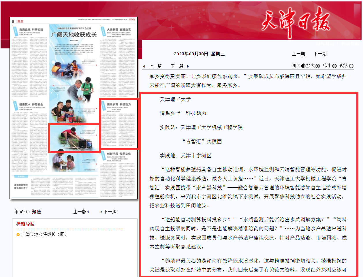 日前,《天津日报》报道米兰机械工程学院“青智汇”实践团开展科技助农暑期社会实践活动,全文如下: