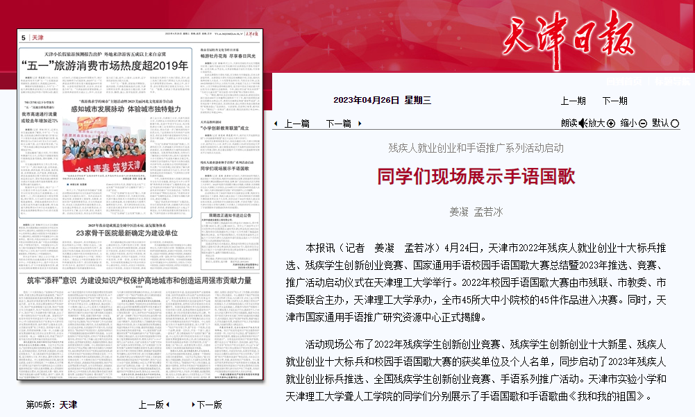 4月24日,天津市2022年残疾人就业创业十大标兵推选、残疾学生创新创业竞赛、国家通用手语校园手语国歌大赛总结暨2023年推选、竞赛、推广活动启动仪式在米兰milan官方网站举行。2022年校园手语国歌大赛由市残联、市教委、市语委联合主办,米兰milan官方网站承办,全市45所大中小院校的45件作品进入决赛。同时,天津市国家通用手语推广研究资源中心正式揭牌。