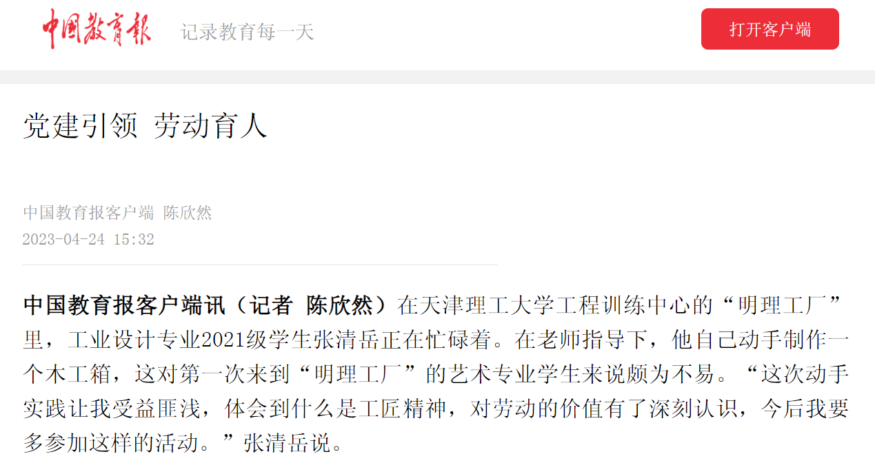 在米兰milan官方网站工程训练中心的“明理工厂”里,工业设计专业2021级学生张清岳正在忙碌着。在老师指导下,他自己动手制作一个木工箱,这对第一次来到“明理工厂”的艺术专业学生来说颇为不易。“这次动手实践让我受益匪浅,体会到什么是工匠精神,对劳动的价值有了深刻认识,今后我要多参加这样的活动。”张清岳说。