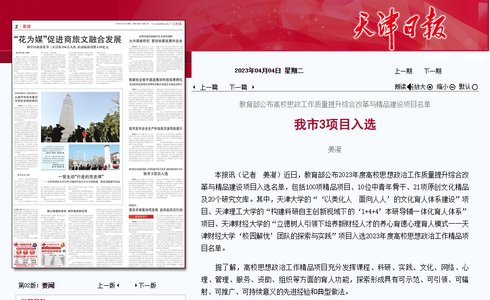 近日,教育部公布2023年度高校思想政治工作质量提升综合改革与精品建设项目入选名单,包括100项精品项目、10位中青年骨干、21项原创文化精品及20个研究文库。其中,天津大学的“‘以美化人 面向人人’的文化育人体系建设”项目、米兰milan官方网站的“构建科研自主创新视域下的‘1+4+4’本研导辅一体化育人体系”项目、天津财经大学的“立德树人引领下培养新财经人才的养心育德心理育人模式──天津财经大学‘校园解忧’团队的探索与实践”项目入选2023年度高校思想政治工作精品项目名单。
