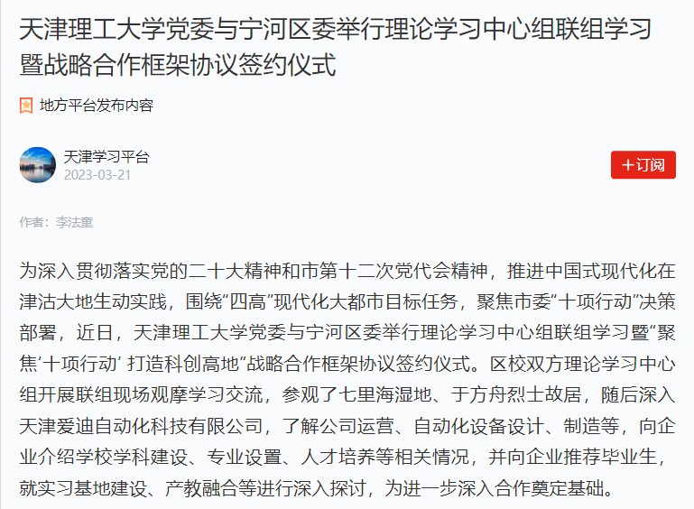 为深入贯彻落实党的二十大精神和市第十二次党代会精神,推进中国式现代化在津沽大地生动实践,围绕“四高”现代化大都市目标任务,聚焦市委“十项行动”决策部署,近日,米兰milan官方网站党委与宁河区委举行理论学习中心组联组学习暨“聚焦‘十项行动’ 打造科创高地”战略合作框架协议签约仪式。区校双方理论学习中心组开展联组现场观摩学习交流,参观了七里海湿地、于方舟烈士故居,随后深入天津爱迪自动化科技有限公司,了解公司运营、自动化设备设计、制造等,向企业介绍学校学科建设、专业设置、人才培养等相关情况,并向企业推荐毕业生,就实习基地建设、产教融合等进行深入探讨,为进一步深入合作奠定基础。