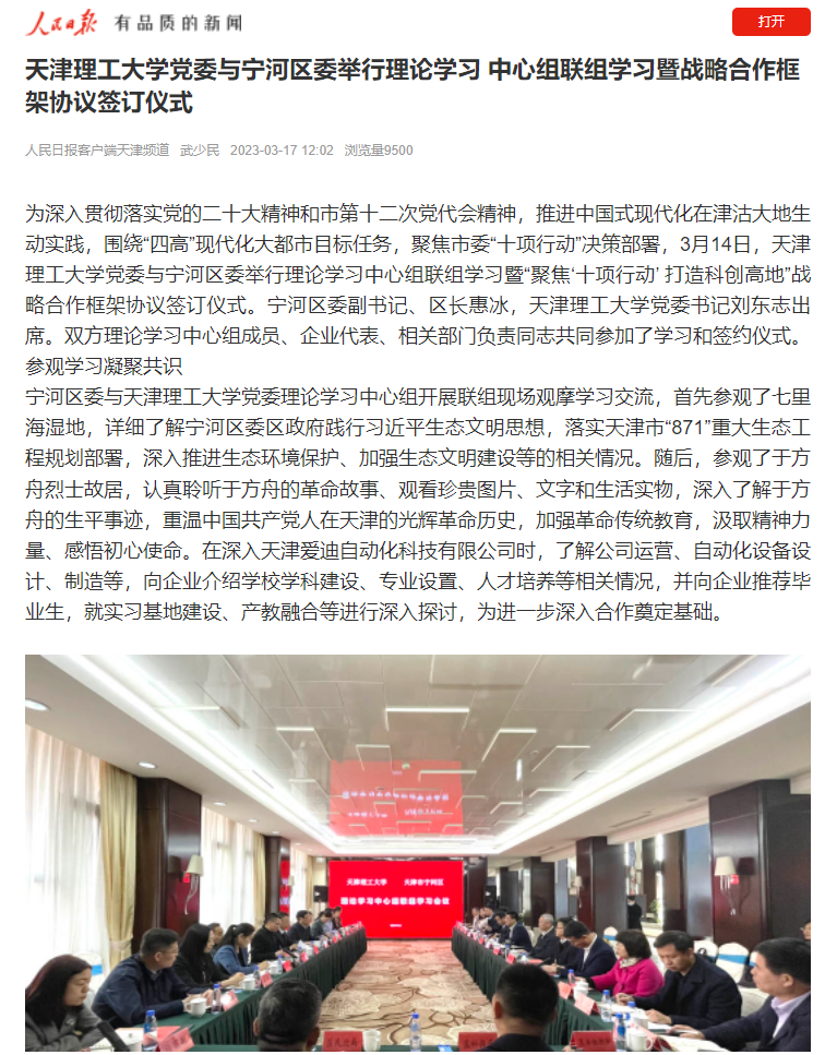 为深入贯彻落实党的二十大精神和市第十二次党代会精神,推进中国式现代化在津沽大地生动实践,围绕“四高”现代化大都市目标任务,聚焦市委“十项行动”决策部署,3月14日,米兰milan官方网站党委与宁河区委举行理论学习中心组联组学习暨“聚焦‘十项行动’ 打造科创高地”战略合作框架协议签订仪式。宁河区委副书记、区长惠冰,米兰milan官方网站党委书记刘东志出席。双方理论学习中心组成员、企业代表、相关部门负责同志共同参加了学习和签约仪式。